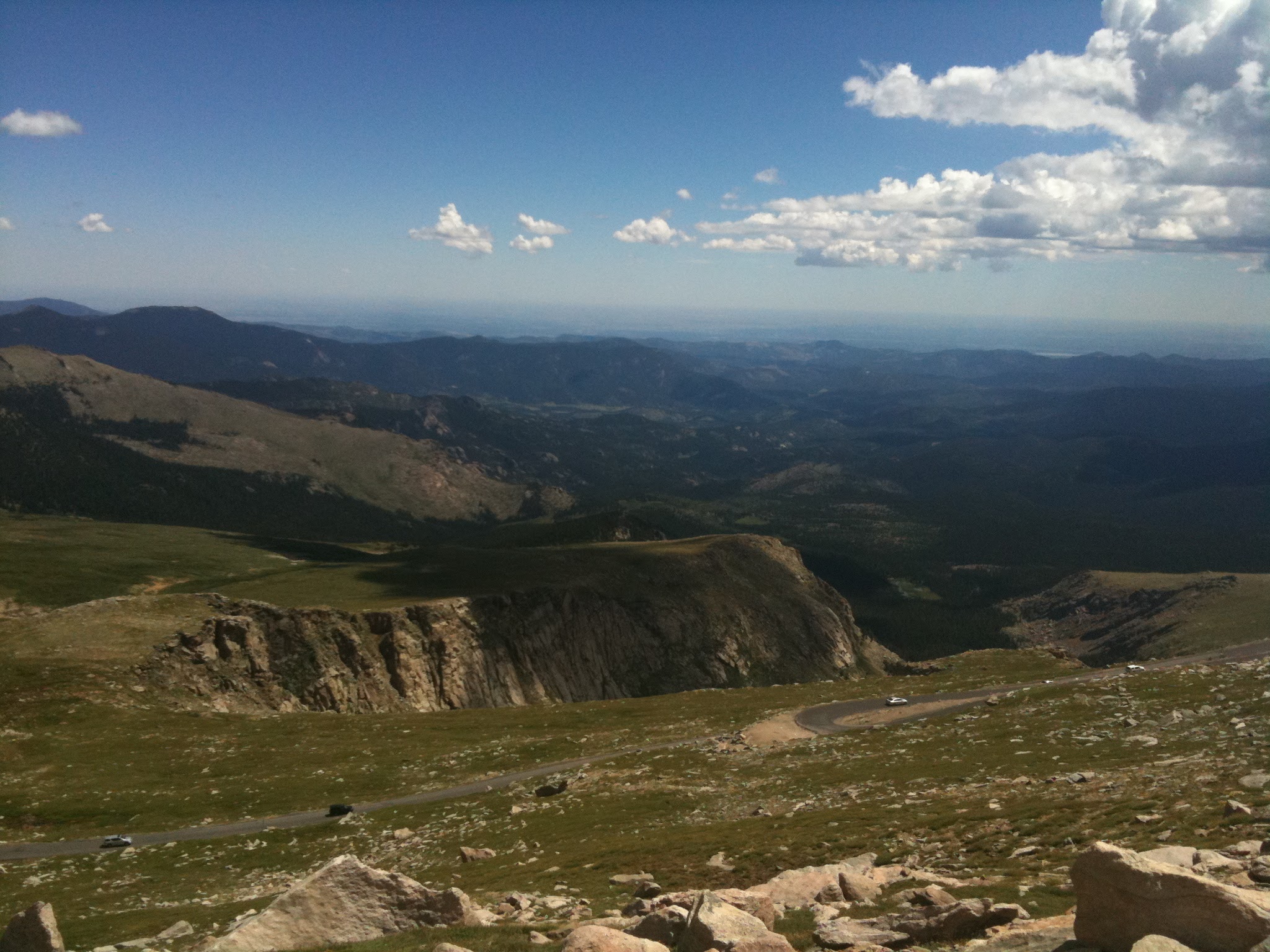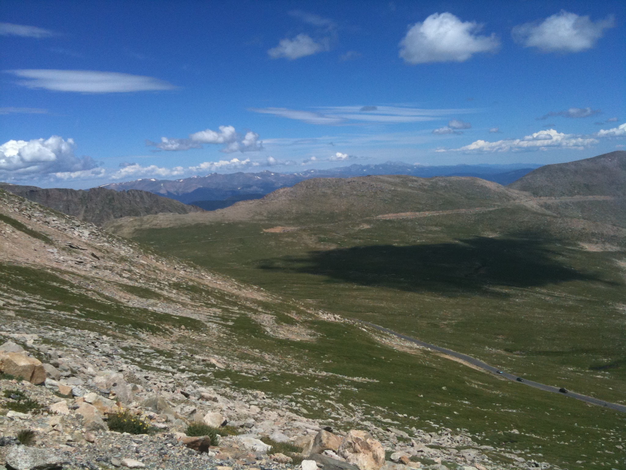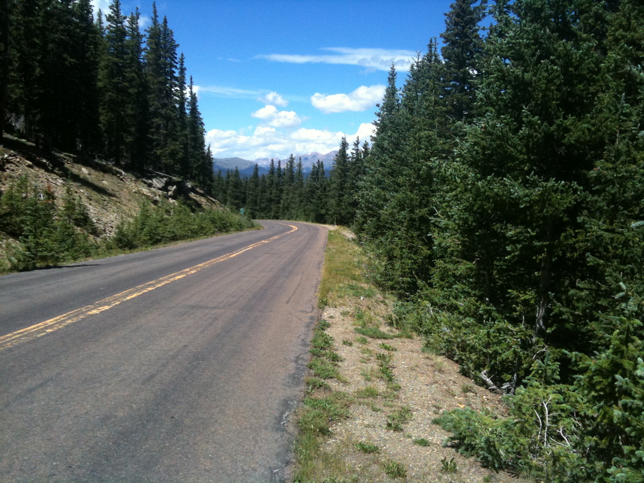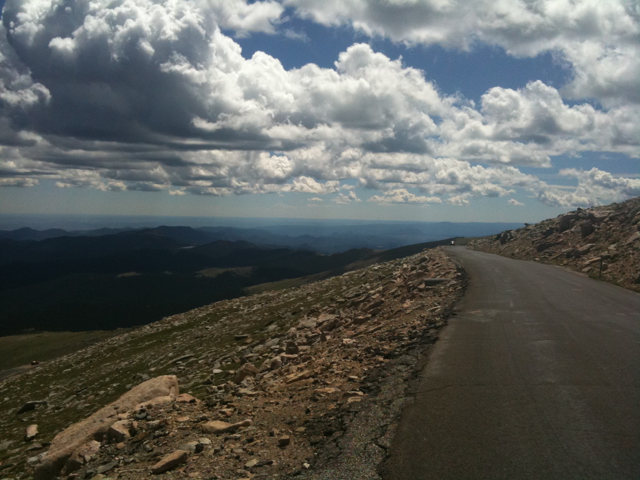 I didn’t know how I would feel at elevations greater than 12,000ft so I road the 1st 3/4 of the route conservatively, but I felt surprisingly good at the top, finishing with a time of 3:14. Though the temperatures in Denver were in the 90Fs, the summit temperature was hovering around 50F and as I turned to head back down, the time being just before noon, the clouds were steadily starting to build. Aside from several very tight banked switch backs that you could carry a lot of speed through, the downhill was actually quite mundane and very choppy at times.
